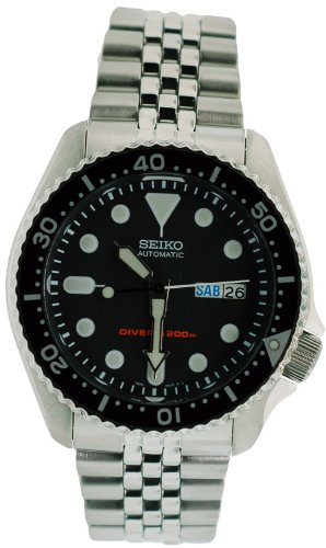 You Save : 52% Seiko Men's SKX007K2 Diver's Automatic Watch ● Stainless steel case and bracelet ● Black dial ● Luminous hands and hour markers ● Black unidirectional elapsed time bezel ● Sweep second hand;Scuba diver's ● Water resistant to 200 meters ● Date and day display at 3:00 ● Hardlex crystal; ● Japan automatic movement ● Fold-over clasp with safety